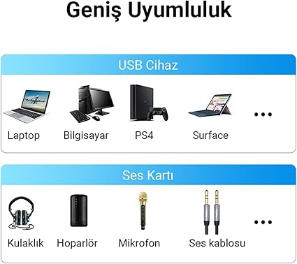 VegGieg USB 2.0 to 3.5mm Ses Kartı, bilgisayar, Notebook, Microsoft Surface Tablet, Sony PS4 ve PS5 cihazlarınızdan ses çıkışı alabilirsiniz ve mikrofon girişi sayesinde ses kaydı yapabilirsiniz. TRS desteği sayesinde üzerinde bulunan 2 adet 3.5mm Jak girişinden mikrofon, kulaklık veya headset kullanabilirsiniz.