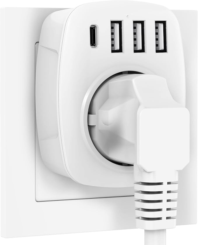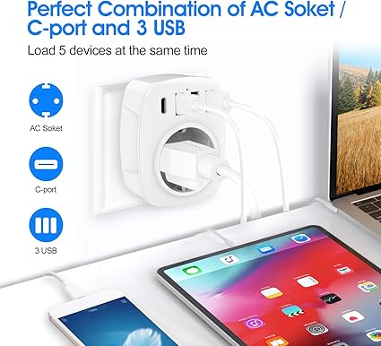 USB soketi, soketleri, 3 USB şarj cihazı (2.4A) ve 1 Tip-C bağlantı noktası (3A), 5’i 1 arada soket adaptörü, USB şarj cihazı, duvar prizi adaptörü, ev aletleri için, akıllı telefon, MP3, PC (beyaz)