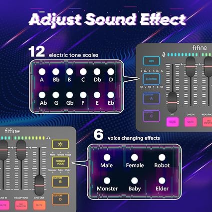 DJ ses mikserindeki RGB düğmesi, farklı canlı akış temalarına uyum sağlar. Dört bağımsız kanal, MICROPHONE, LINE-IN, KULAK ve LINE-OUT kanallarının ses seviyesi üzerinde bireysel kontrol sağlar. Ön tarafta sessize alma ve izleme düğmeleri bulunur. Ses mikseri, önceden kaydedilmiş dört özel düğmeyi destekler. Altı tür ses değiştirme modu çıkış stilinizi değiştirir. On iki otomatik ayar modu sesinizin tonunu değiştirir.