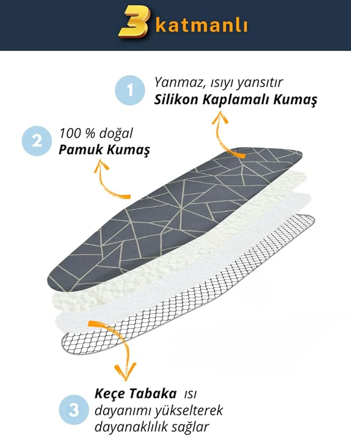 KALİTELİ MALZEME: %100 pamuklu kumaş ve geri dönüştürülebilir keçe sayesinde ütüleme işlemi çok kolay olacak. Kumaşın üzerine uygulanan diğer katman olan silikon kaplama ile kılıfınız yanmayacak ve ürünleriniz zarar görmeyecektir.