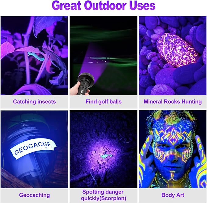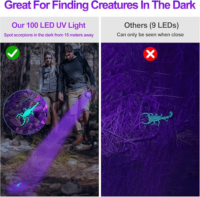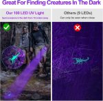 Yaratıklar 15 metre uzaklıktadır: 100 ışık led UV lambası diğer siyah ışığa göre% 200 daha parlaktır, akrepler, akrepler UV el feneri altında floresan gösterir, sahada 15 metre uzaklıktaki akrepler yapabilir ve zaman içinde tehlikeyi belirleyebilirsiniz, karanlıkta spot golf topları için ideal, tüm kayıp toplar fenerler gibi parlayacak