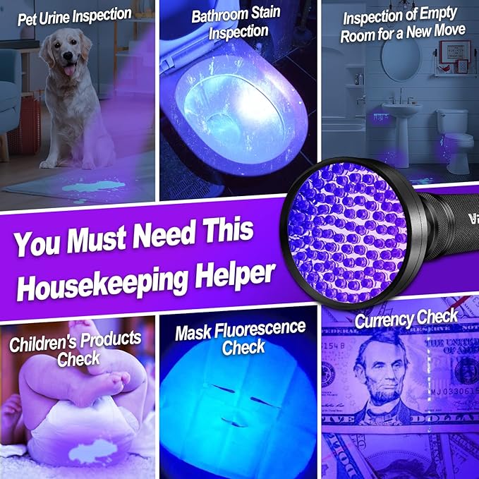 Evde evcil hayvan sahibi olmalıdır: Vansky 100 UV ışıklı LED el feneri, gün ışığında bile evde lekeleri tespit etmenize ve zamanında temizlemenize yardımcı olabilir, kuru evcil hayvan/kedi/köpek idrarını gösterir, halı/kanepe/zemindeki oda görünmez lekeleri çıkarır, flüoresan ajanları çocuklardan uzakta kontrol edin, tuvaletleri ve mutfakları kontrol edin, bu dedektör ışığı yardımcı olur, daha iyi temizlik, her OKB temizlik kişisinin bir tanesine sahip olması gerekir