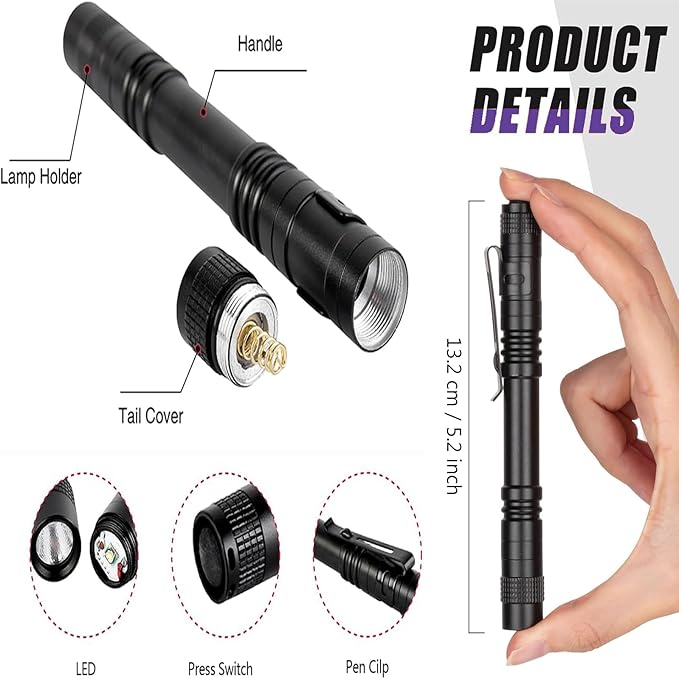 【Kullanışlı ve Kompakt】 UV meşale konsantre bir alanı aydınlatabilir ve ince, kompakt ve hafif profili sayesinde küçük dar alanların bulunduğu çalışma alanlarını aydınlatmak için uygundur. Süper rahat bir deneyim sağlamak için cebinizde kolayca tutulan küçük bir klipsle. Kemerinize, çantanıza, bağlayıcınıza, gömleğinize veya pantolon cebinize de kolayca takılabilir.