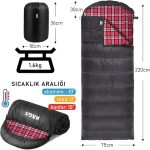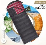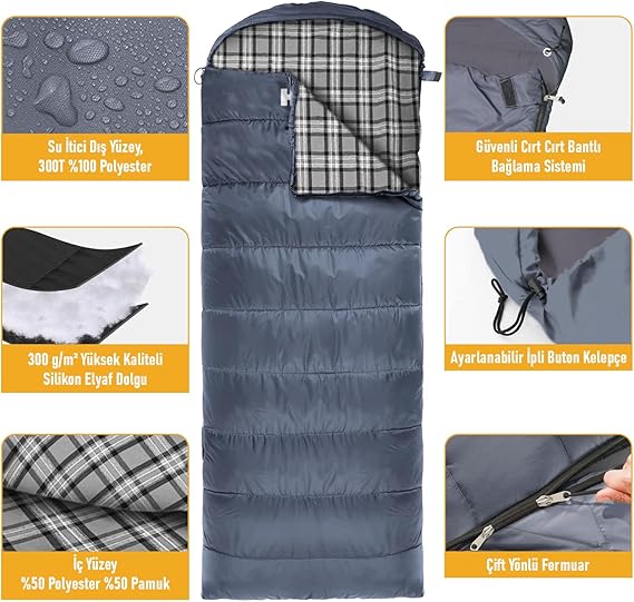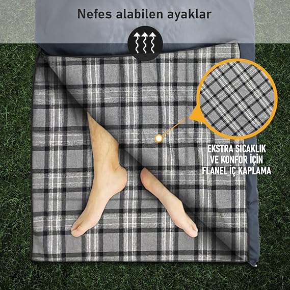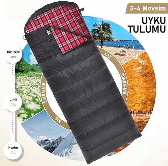 ✅ KONFORLU VE SICAK UYKU TULUMU: Kamp uyku tulumunun dış kumaşı su itici özellikli %100 polyesterden oluşur, iç astar %50 Pamuk – %50 Polyester Flanel kumaştır ve 300 g/m²’lik yüksek kaliteli silikon elyaf dolgu sıcaklık ve uzun ömür sağlar. Kış uyku tulumunun sıcaklık aralığı: Konfor: 10°C / Limit: 0°C / Ekstrem: -10°C ve farklı sıcaklıklar dikkate alınarak farklı mevsimlerde ve farklı sıcaklıklarda sıcak bir uykunun tadını çıkarabilirsiniz.