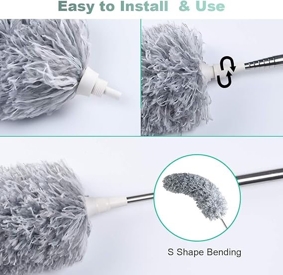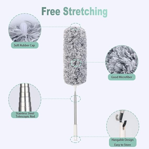 【Geri çekilebilir toz toplayıcı】Süper ince elyaf başlık geniş bir alanı kaplar, serbestçe deforme olabilir, katlanabilir ve maksimum 243 cm uzunluğa kadar kolayca gerilebilir. Yüksek yerleri temizlemek için genişletilebilir. Toz toplayıcı, gizli yerleri temizlemek için herhangi bir açıda oluşturulabilir.