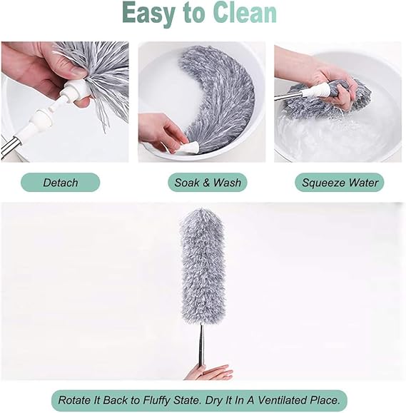 【KOLAY SAĞLAMA VE TEMİZ】 Bu mikrofiber silginin temizlenmesi kolaydır. Toz bezi çıkarılabilir olduğundan, ılık veya düşük suyla elde yıkayabilir, ardından sıkıp kurutabilirsiniz. Fiber fırçayı doğal olarak kabarık hale getirin. Kolay saklama ve yer tasarrufu için katlanabilir başlık ve geri çekilebilir çubuk.