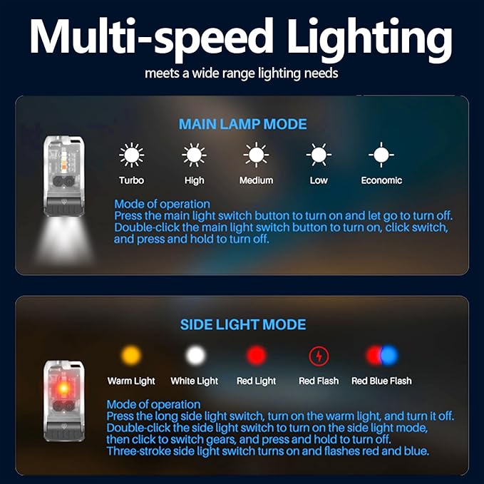 【80° Dönebilen ve 10 Mod】: 80 derece dönebilen fara sahip V15 küçük güçlü el feneri, ihtiyaçlara göre uygun aydınlatma açısına ayarlanabilir, onarım/kamp/iş ve diğer senaryolar için çok uygundur. 5 ana ışık moduna sahiptir: Turbo, Yüksek, Orta, Düşük, Ekonomik ve 5 yan ışık modu: Sarı ışık, Beyaz ışık, Kırmızı ışık, Kırmızı flaş, Kırmızı ve mavi flaş. Ek: Son derece parlak modu açmak için ana ışık anahtarı düğmesini basılı tutun ve kapatmak için bırakın. Kırmızı ve mavi yanıp sönmeyi açmak için yan ışık düğmesine üç kez tıklayın.