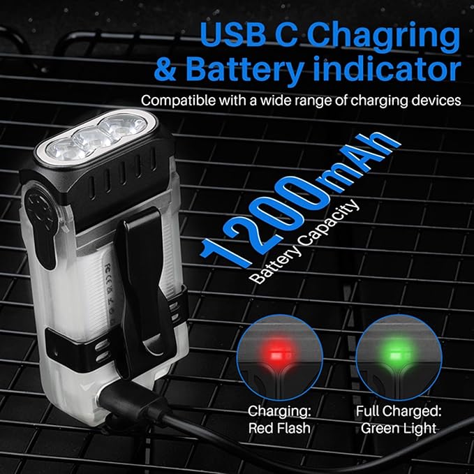 【Floresan ve Tip-C Şarj Edilebilir】: USB mini el feneri, güçlü ışığı emerken güzel floresan renkler yayar, karanlıkta hızlı bir şekilde bulmayı kolaylaştırır. El feneri, şarj edilmesi yaklaşık 4 saat süren ve 4 ~ 46 saat pil ömrüne sahip dahili bir 1200mAh şarj edilebilir pile sahiptir. Şarj gösterge ışığı şarj sırasında kırmızı ışık ve dolduğunda yeşil ışık gösterir.