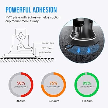 Önemli İpuçları: Her gösterge paneli yapışkan pedinin yapışkanlığı yalnızca bir kerelik kullanımdır. Tekrar kullanılamaz. Vantuzlu telefon montajı için desteklenen tek taraflı yapışkanlı premium yarı kalıcı yapışkan disk, nispeten düz bir yüzeye monte edilmelidir. Daha iyi bağlantı sağlamak için 60 s boyunca aşağı bastırmanız daha iyi olur. Yapışkan çıkartmaya ellerinizle dokunmayın. Lütfen herhangi bir basınç uygulamadan önce yapışkan alt tabanların yüzeye sertleşmesi için 24 saat bekleyin. Ne kadar uzun süre beklerseniz, o kadar yüksek bağ
