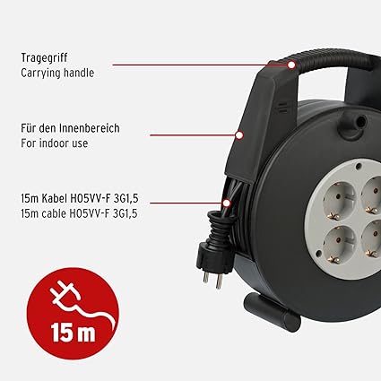 Vario Line Serisi IP20 Lisanslı 4 Soketli 15 Metre Makaralı Kablo, Siyah, 1 adet
