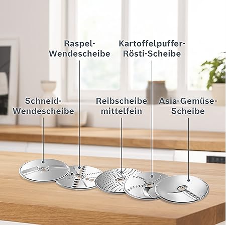 VeggieLove MUZ5VL1 aksesuar seti, 5 dilim içeren sürekli şnitzler (kesme tornalama diski, törpüleme diski, orta ince rende diski, Asya sebzeleri ve rösti için), çok renkli