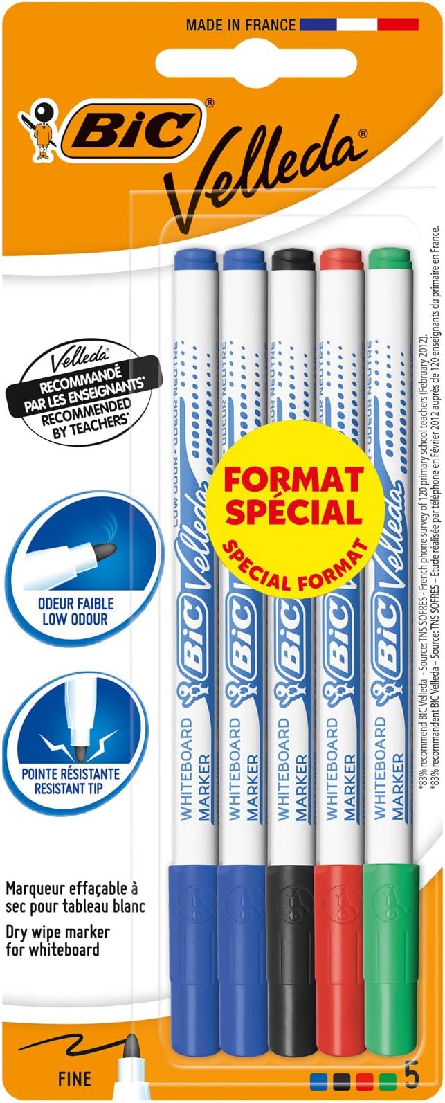 Velleda 1721 Çocuk Beyaz Tahta Kalemi 5’li Blister, Mavi, Siyah,Kırmızı ve Yeşil Renk, Kolay Silinebilir