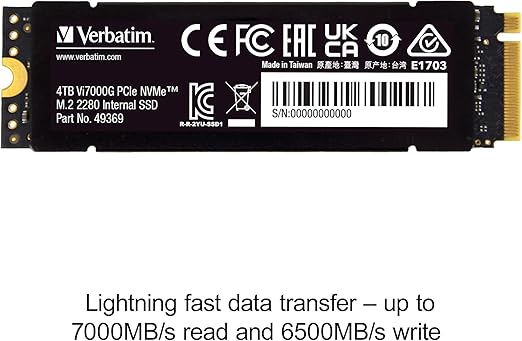 Teslimat kapsamı: 1 x Vi7000G NVMe M.2 dahili SSD 4 TB depolama kapasitesi, Verbatim dahili SSD sürücü, 80 x 23 x 9,8 mm, 38,5 g