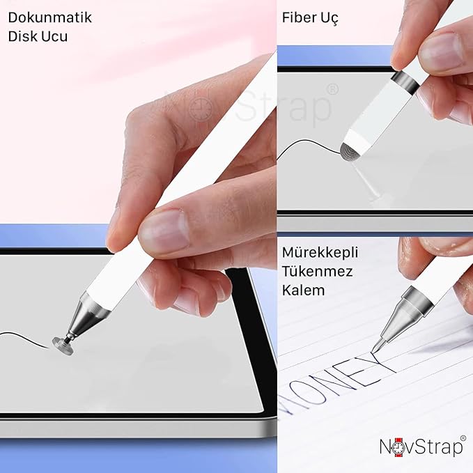 Kullanma Yöntemi : Kalem üzerinde Çek-Aç şeklinde açılan 2 adet kapak vardır. Bu kapaklardan bir tanesi üzerinde bulunan “Fiber Uç” ile Akıllı Tahtalarda kalem olarak kullanabilirsiniz. Kapakları Açtığınızda çıkan Disk şeklindeki silikon uç; “Dokunmatik Kalem” Ucudur. Disk Şeklindeki bu uç ile tüm tablet ve telefonlarda dokunmatik kalem olarak kullanabilirsiniz. Diğer taraftaki kapak açıldığında çıkan uç ise Tükenmez Kalemdir. Klasik tükenmez kalem olarak kağıda yazı yazmak amacıyla kullanabilirsiniz.