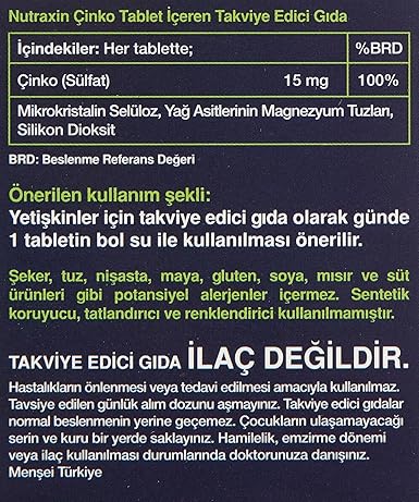 Nutraxin Zinc ; içeriğinde 15 mg çinko minerali içerir.