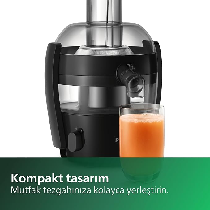 KOMPAKT TASARIM – Mutfak tezgahında yer tasarrufu sağlar; standart meyve sıkacaklarının yarısı boyutunda; saklama veya günlük kullanım için kolay; küçük mutfaklar için ideal şık tasarım.