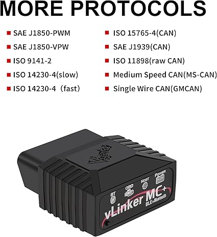 GENİŞ ARAÇ UYUMLULUĞU – Vgate vLineker MC+ (BT3.0/ BLE4.0) çalışır OBD2 protokolünü destekleyen 1996 ve sonrasında üretilen tüm 12V benzinli araçlar ve 12V küçük dizel araçlar (yük kapasitesi 6,5T veya altı) için uygundur. Standart OBD-II protokolüne ek olarak, GM ve Ford gibi markaların tescilli ağlarına erişim sağlayan SW-CAN ve MS-CAN protokollerini de destekler. (NOT: 24V güç dizel otomobilde kullanmayın);