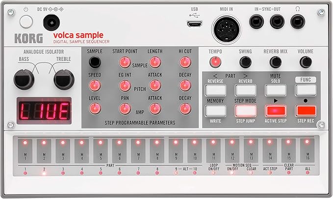 Volca Sample sekiz sesli polifoni, dijital salon, zengin içerikli çift filtre ve numune manipülasyonu için birçok regülatör sunan gelişmiş bir numune makinesidir.