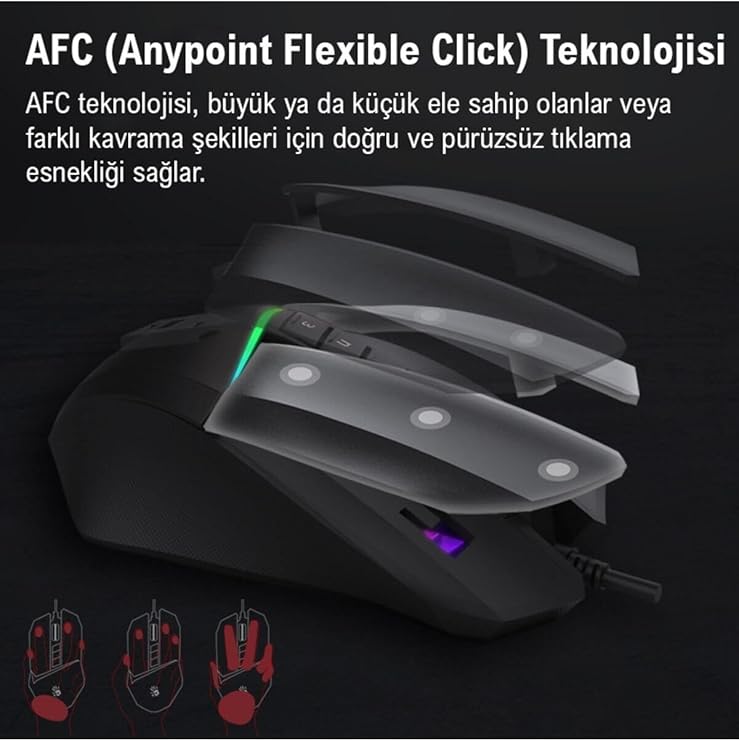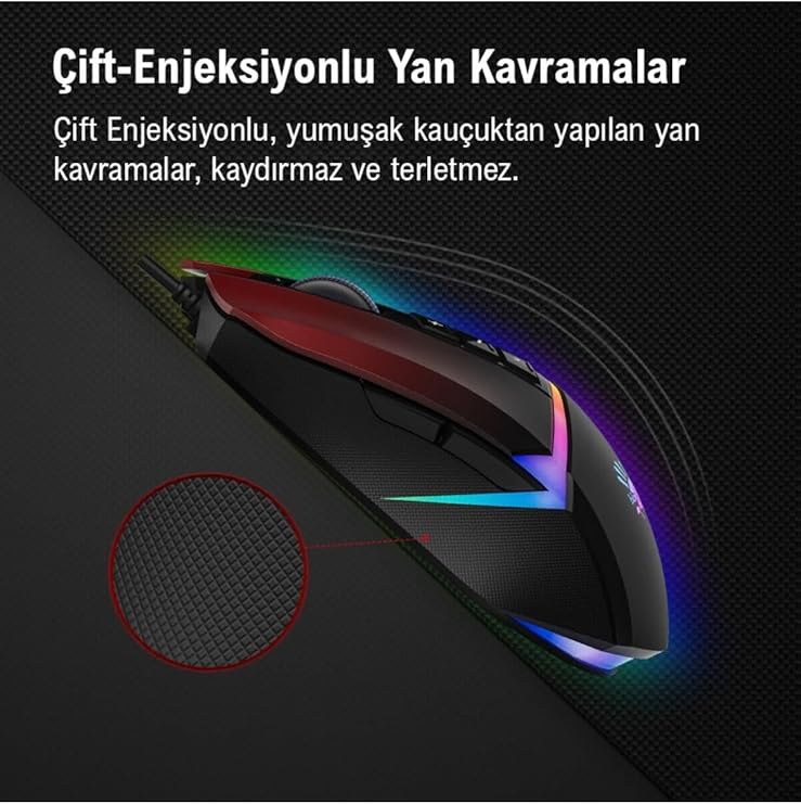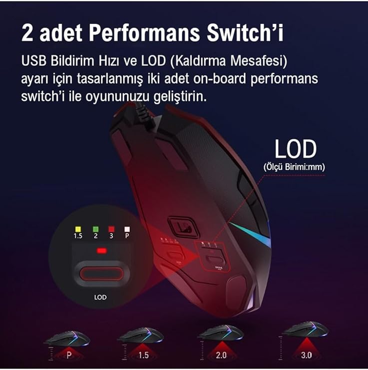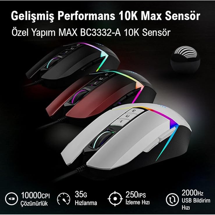 100-10.000 CPI çözünürlüğe kadar ayarlayabilme (Yazılım yüklenince) 4M dahili bellek 10 Buton ve Tek Scroll 1msn switch tepki süresi 50 Milyon Tıklama tuş kullanım ömrü 8000 fps çerçeve hızı 35g maksimum hızlandırma