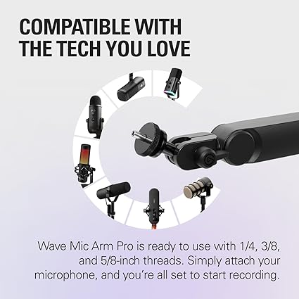 Düşük profil: Wave Mic Arm Pro, ultra sessiz, kolay ayarlamalar için yüksek kaliteli yay teknolojisi sunar; Audio-Technica, HyperX, Rode, Shure, FiFine, Logitech ve daha fazlası gibi birçok mikrofon markası ve modeli ile uyumludur