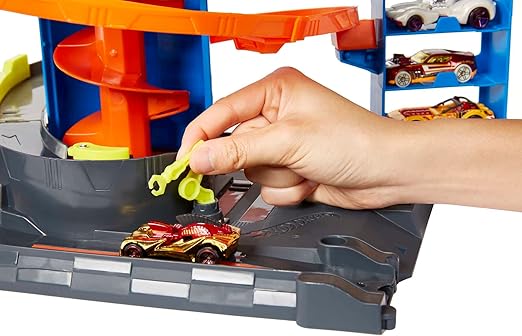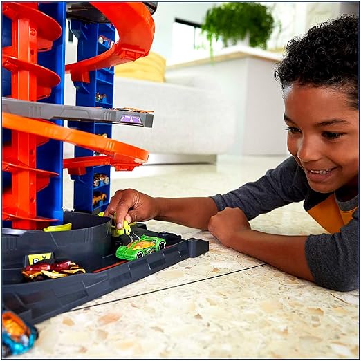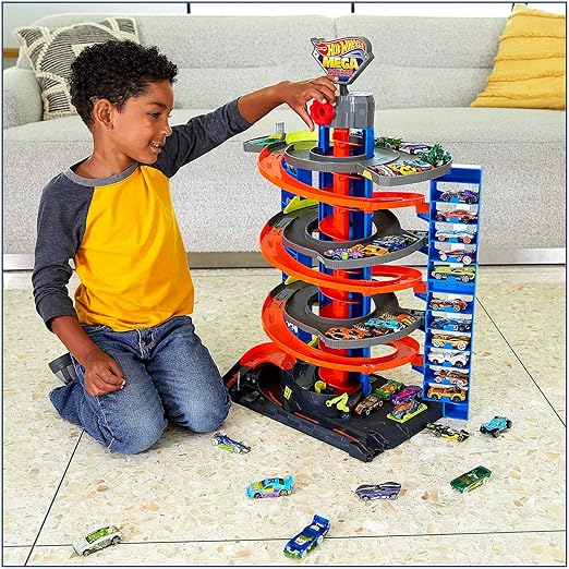 Hot Wheels Mega Garaj Oyun Seti içinde, heyecan verici dört kat, muhteşem sarmal asansör, 60’tan fazla Hot Wheels arabası için park alanı ve etkileyici bir Hot Wheels yapısı oluşturmak için birden fazla bağlantı noktası bulunur