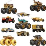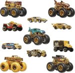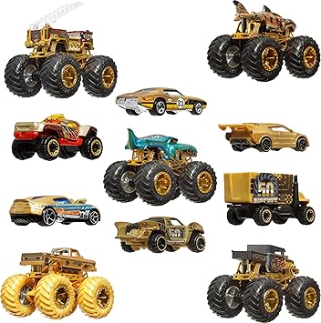 Hot Wheels Monster Trucks Bigfoot şampiyonları araba ve kamyon seti, ilk Monster Trucks kamyonunun 50 yıl dönümünü beş oyuncak kamyon ve altı oyuncak arabayla kutluyor