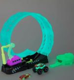 Gerçekten karanlıkta parlayan DEV çember gibi parçalara sahip Hot Wheels Monster Trucks Karanlıkta Parlayan Çemberde Yarış Seti ile ışıkları kapatıp yarışa devam edin.