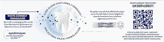 İçerdiği mavi-safir pigment teknolojisi sayesinde hassasiyetin yanı sıra yüzey lekelerine de etki ederek dişlerde anında beyazlık yakalanmasına destek olur