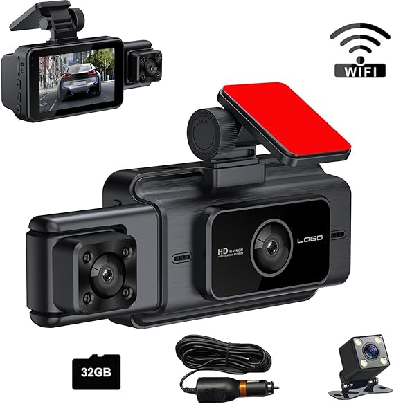 WiF araç sürüş kayıt cihazı, n araç DVR, kablolu yüksek çözünürlüklü 1080P kızılötesi gece görüşü ve Black1 32G’nin ön ve arka üç lensiyle aynı anda geri vites kaydı