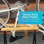 Taşınabilir çalışma tezgahı sağlam bir çelik çerçeveye ve ahşap çenelere sahiptir