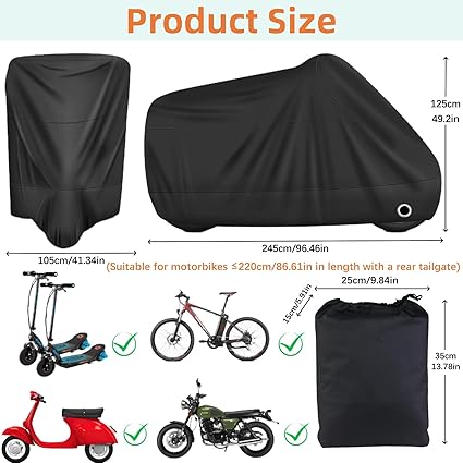 【Uygun Boyut XXL】245 x 105 x 125 cm (96,46 x 41,34 x 49,21 inç) ölçülerinde bir motosiklet kılıfı ve siyah bir çanta alacaksınız. Motosiklet, bisiklet, scooter, moped, elektrikli motosiklet, arazi motosikleti vb. birçok araç türünde yaygın olarak kullanılır. Tutarlılığı sağlamak için lütfen satın almadan önce aracınızın boyutunu dikkatlice ölçün.