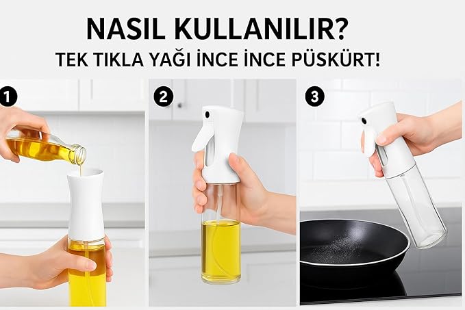 200 ml Geniş Kapasite: Geniş hacmi sayesinde uzun süre dolum yapmadan kullanılabilir; zeytinyağı, ayçiçek yağı, limon suyu ve sirke gibi sıvılar için uygundur.