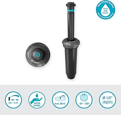 Yağmurlama sistemi MD80: 80 m²’ye kadar orta büyüklükteki çim alanlar için Pop-up sulama sistemi, 3,5 – 5 m menzil, döner başlık, 1/2 inç iç dişli (8232-20)