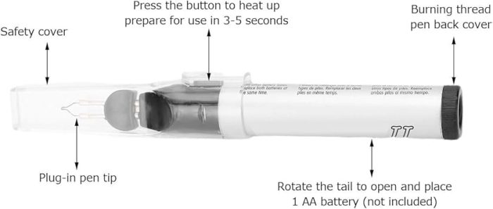Bu iplik yakma kalemi, şaltere bastıktan hemen sonra hızlı ve ısınır. Kullanımı kolaydır.