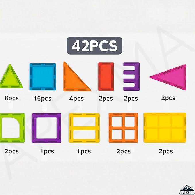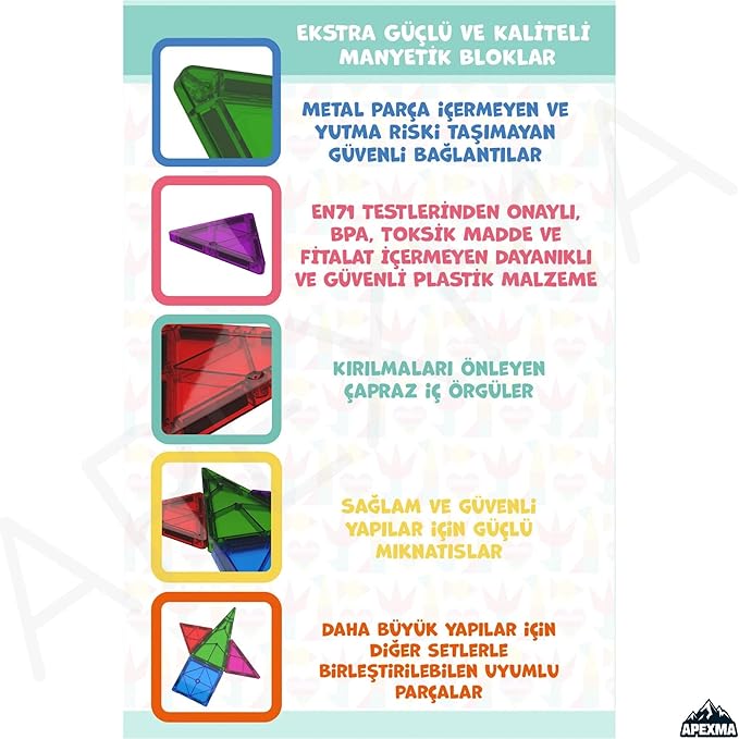 Ürün Özellikleri: Set İçeriği: 42 adet farklı geometrik şekil (kare, üçgen, dikdörtgen, pencere gibi parçalar) Malzeme: Yüksek kaliteli, toksik olmayan ABS plastik Mıknatıslı Tasarım: Parçalar güçlü mıknatıslarla kolayca birleşir ve sağlam durur Renkli ve Şeffaf Görünüm: Canlı renkleriyle çocukların ilgisini çeker Eğitici Katkı: El-göz koordinasyonunu, problem çözme yeteneğini, uzamsal düşünme ve yaratıcılığı destekler Yaş Grubu: 3 yaş ve üzeri çocuklar için uygundur Parça Sayısı: 42 Parça