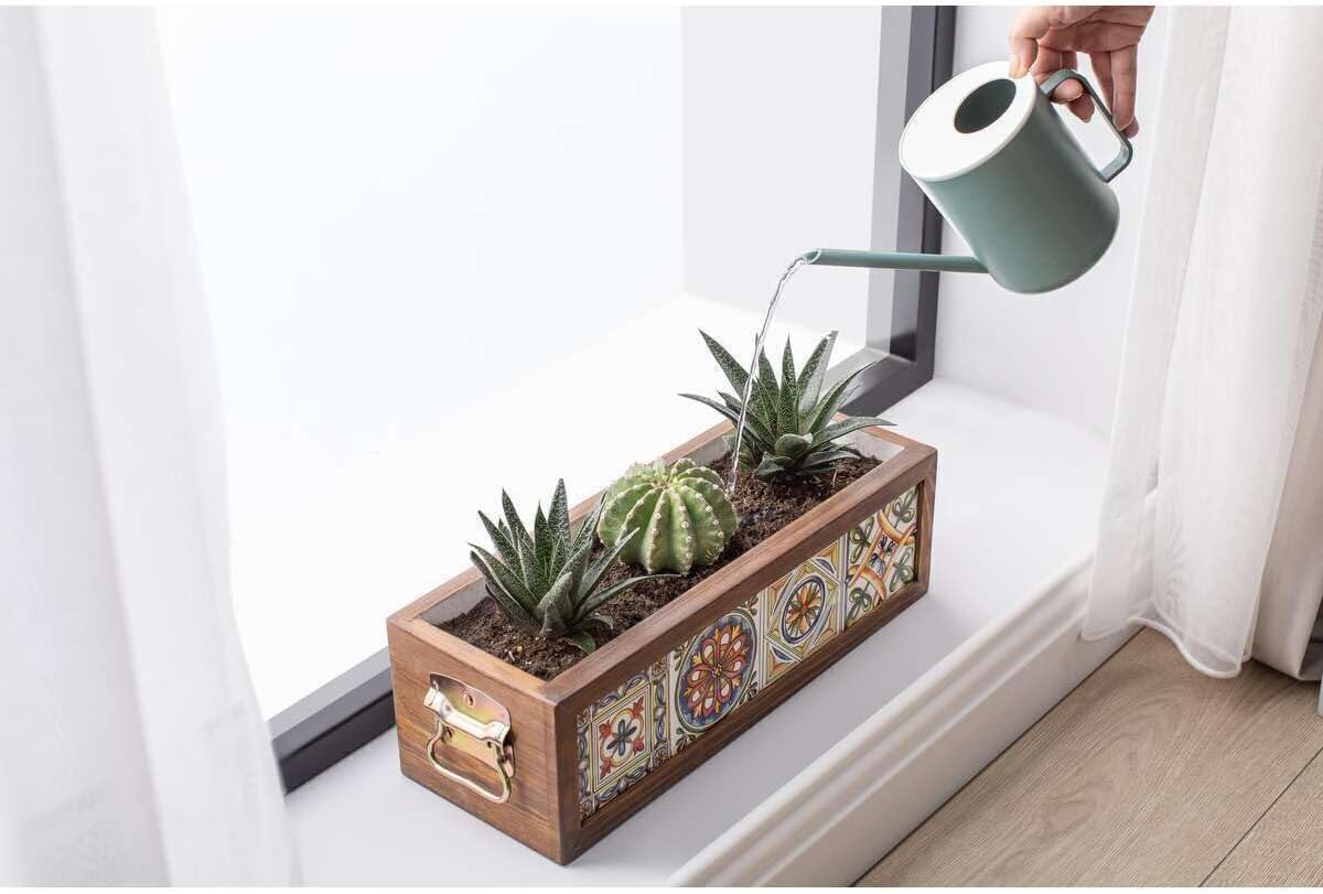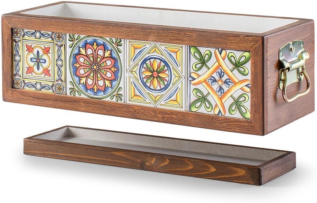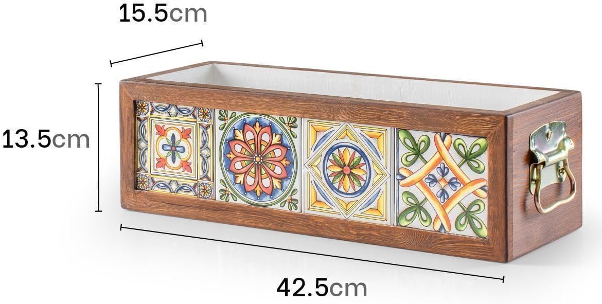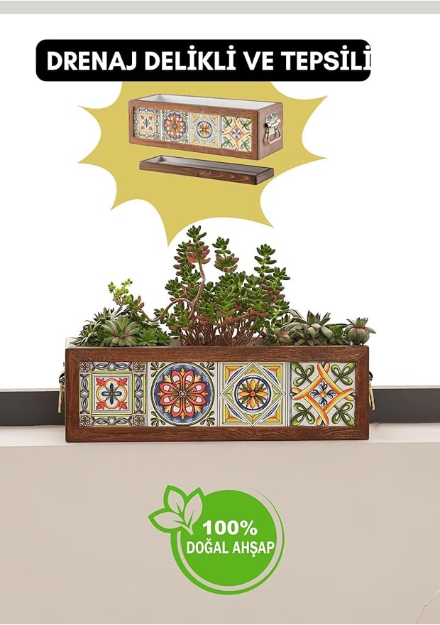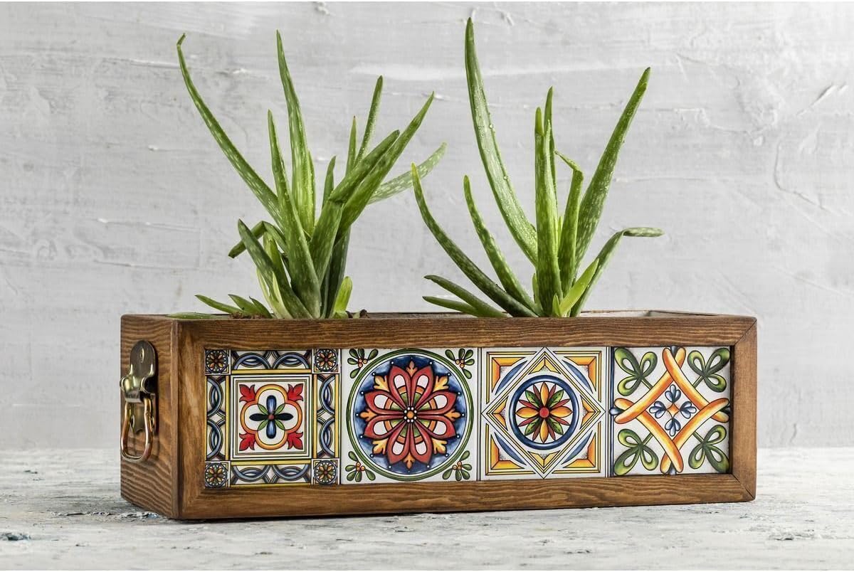 Yapımı 4 Meksika Çinili Dekoratif Modern Ahşap Dikdörtgen Bahçe Balkon Saksı Saksılık Çiçeklik