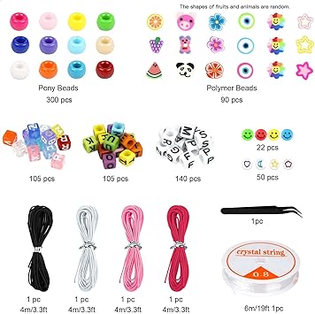 【Mükemmel Bilezik Yapımı Kiti】 Bir kutuda 12 renkte yaklaşık 300 adet midilli boncuk, 6 tipte yaklaşık 90 adet polimer kil boncuk bulunur (gülümseme boncukları, hayvan boncukları, meyve boncukları, çiçek boncukları, gökkuşağı boncukları ve yıldız boncuklar içerir), 350 adet rastgele 3 çeşit harf boncukları, 22 adet plastik gülümseme boncukları ve 50 adet küçük yuvarlak boncuklar, 1 rulo 6 metre elastik ip, 4 dokuma ip. En sevdiğiniz renk ve tarza göre bilezik veya takı yapabilirsiniz.