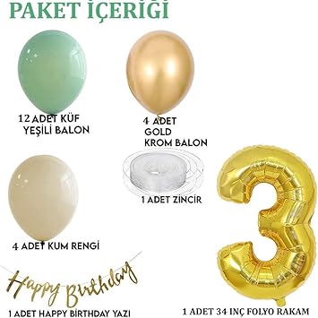 Paket İçeriği: Görselde yer alan Gold 34″ Inc 76 cm rakam folyo balon. (1 adet) 12 Adet Küf Yeşili Balon 4 Adet Krom Gold Balon 4 Adet Deniz Kumu Balon Happy Birthday yazılı Kaligrafi banner. (1 adet) Balon Zinciri 5 metre