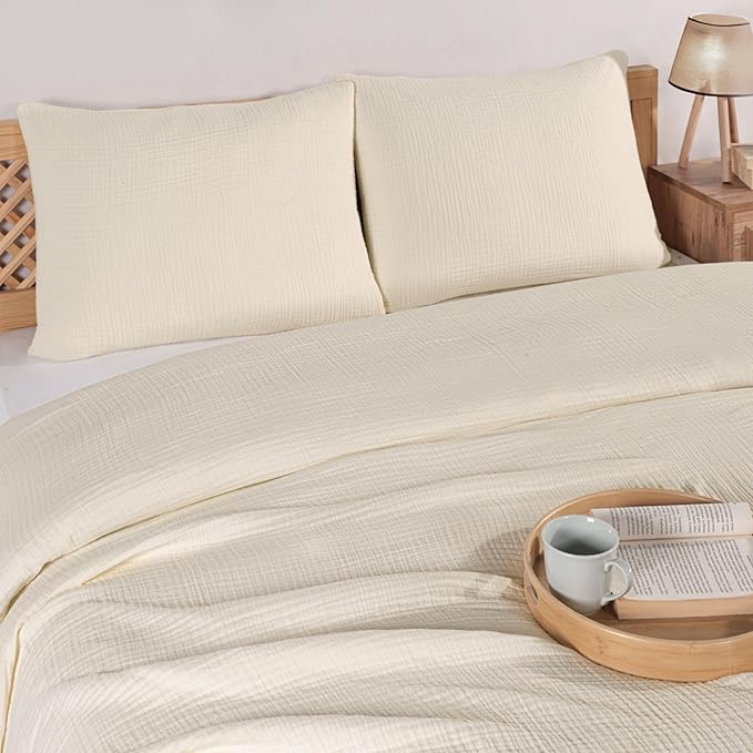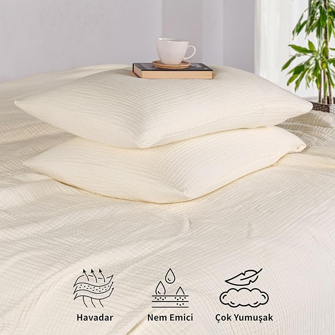Yatak Örtüsü Seti Çift Kişilik, Şık Düz Renk 100% Pamuk 4 Kat Muslin Yastık Kılıflı Pike Takımı, Denizli Üretimi (Natural Renk, Çift Kişilik Set (230×250 cm))