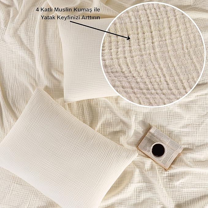 MALZEME: %100 pamuk müslin kumaştan üretilmiş, 4 kat kalınlığında ultra yumuşak ve dekoratif muslin yatak örtüsü seti Rayme Tekstil tarafından Denizli üretimidir