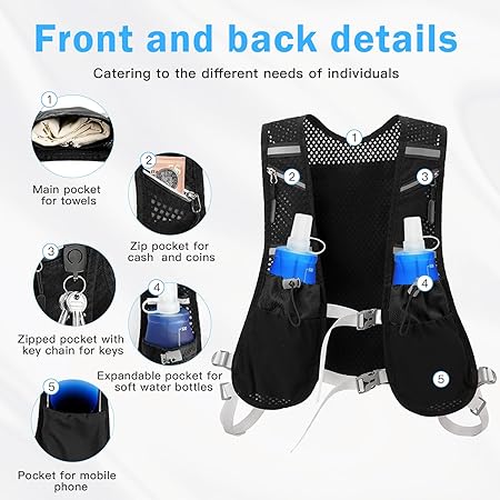 【Geniş depolama alanı】Bu koşu yeleğinin 7 cebi vardır, maraton ve yürüyüşler için her şeyi düzenler: İçecek şişeli koşu yeleğinin arka tarafında büyük fermuarlı bir cebi vardır, hafif ceketler, koşu şapkaları veya havlular için idealdir. Koşu yeleğinin omuzunda küçük miktarlarda para, kulaklık, anahtar vb. için 2 küçük fermuarlı cebi vardır. Koşu yeleği 250, 350 veya 500 ml su şişeleri için 2 ayarlanabilir ön cebe sahiptir; ön tarafta cep telefonları için 2 file cep vardır
