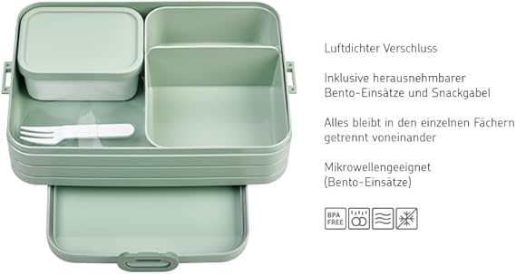 Bölmeli yemek kutusu ve kapaklı ve çatallı ekstra bir kutu, böylece atıştırmalıklar ve öğle yemekleri her zaman taze ve lezzetli kalır. Dondurucuya uygun değildir; gıda maddeleriyle temas için uygundur