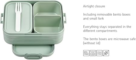 Bölmeli yemek kutusu ve kapaklı ve çatallı ekstra bir kutu, böylece atıştırmalıklar ve öğle yemekleri her zaman taze ve lezzetli kalır. Dondurucuya uygun değildir; gıda maddeleriyle temas için uygundur