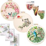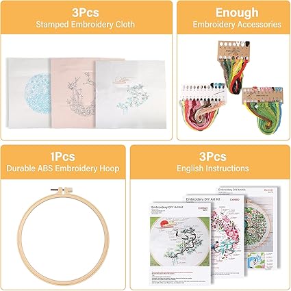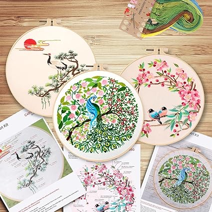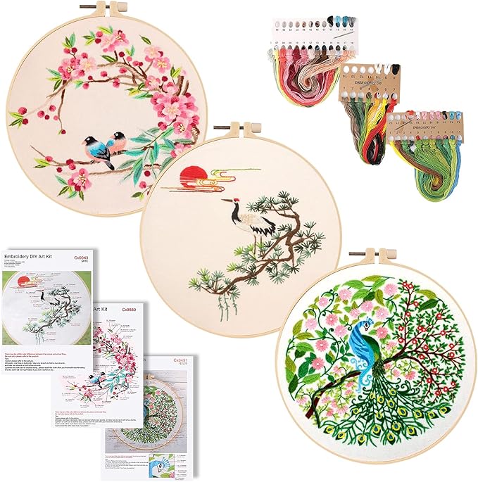 Yeni Başlayanlar İçin Nakış Seti – 3 Set El Yapımı Kanaviçe Başlangıç Kiti, Yuvarlak Ayarlanabilir Alet Seti, Çiçek ve Hayvan Desenli
