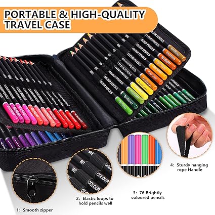 Taşınabilir ve pratik: Yetişkinler için renkli kalemlerden oluşan bu çizim kalemi seti, fermuarlı kumaş taşıma çantası ile korunur, her boya kaleminin kendine ait bir yuvası vardır, böylece bir dahaki sefere ihtiyacınız olan renk tonunu hızlıca bulabilirsiniz. İster seyahatte ister arkadaşlarınızda, çok yönlü kullanım için mükemmeldir.