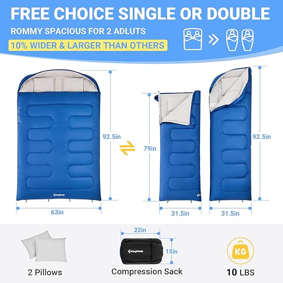 Daha büyük ve daha geniş: 93″ x 63″ boyutundaki bu 2 kişilik uyku tulumu iki yetişkini rahatça uyuyabilir. Açık havada kamp yapan genç aileler için idealdir. 15 “* 8” boyutundaki bir çantaya doldurulmuş, herhangi bir açık hava macerasına, kampa, sırt çantasına, yürüyüşe veya araba yolculuğuna çıkmakta özgürsünüz.