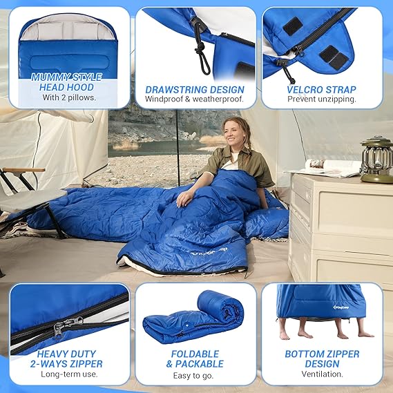 Yetişkinler için Çift Kişilik Uyku Tulumu, XL Büyük ve Uzun Uyku Tulumu Kamp Sırt Çantası için 2 Yastık, Su Geçirmez, 2 Kişilik Queen Boy, Hafif Sıcak ve Soğuk Kamp Ekipmanları