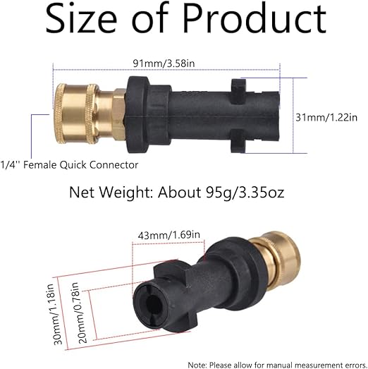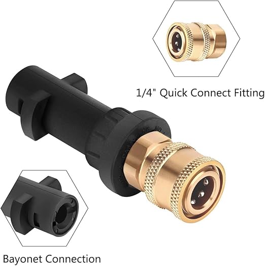 Donanım: Bu 1/4 inç dişi bağlantı adaptörü, iyi basınç kapasitesine sahip K2’den K7’ye kadar Karcher K serisi basınçlı yıkayıcılarla uyumludur
