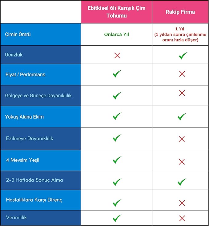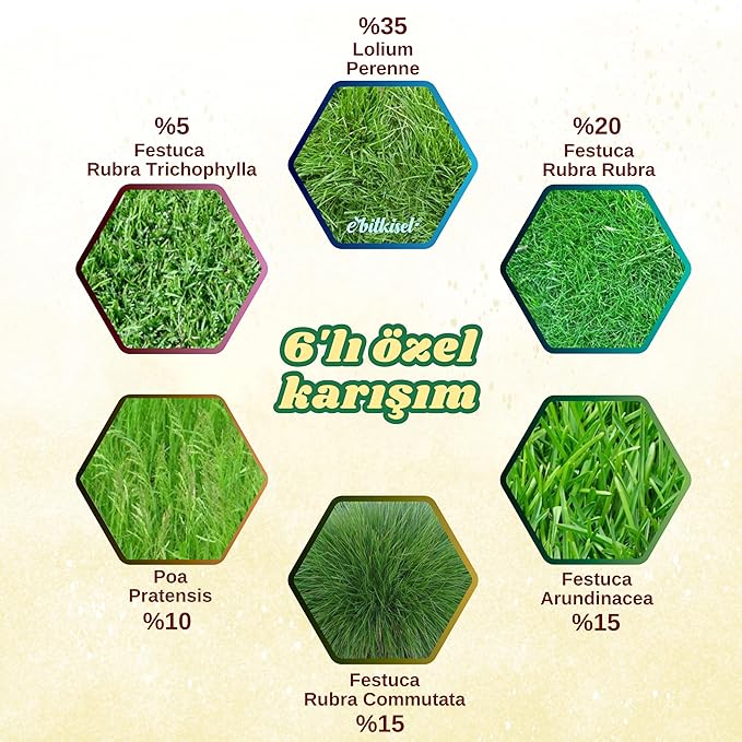 ✔ 6 Farklı Tohum Karışımı – Farklı iklim ve toprak koşullarına uygun özel türler içerir. ✔ Gölge ve Aşırı Güneş Alanlara Uyumlu – Hem az güneş gören hem de yoğun güneşe maruz kalan alanlarda sağlıklı büyür. ✔ Hızlı Çimlenme ve Güçlü Kök Yapısı – Kısa sürede filizlenir ve sık, dayanıklı bir çim örtüsü oluşturur.