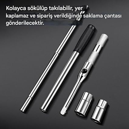 Kompakt Depolama: Araçta yer tasarrufu için özel tasarlanmış hafif çanta içerir. Sökülebilir sap ve soket sistemi, lastik anahtarınızı düzenlemeyi ve taşımayı basitleştirir.